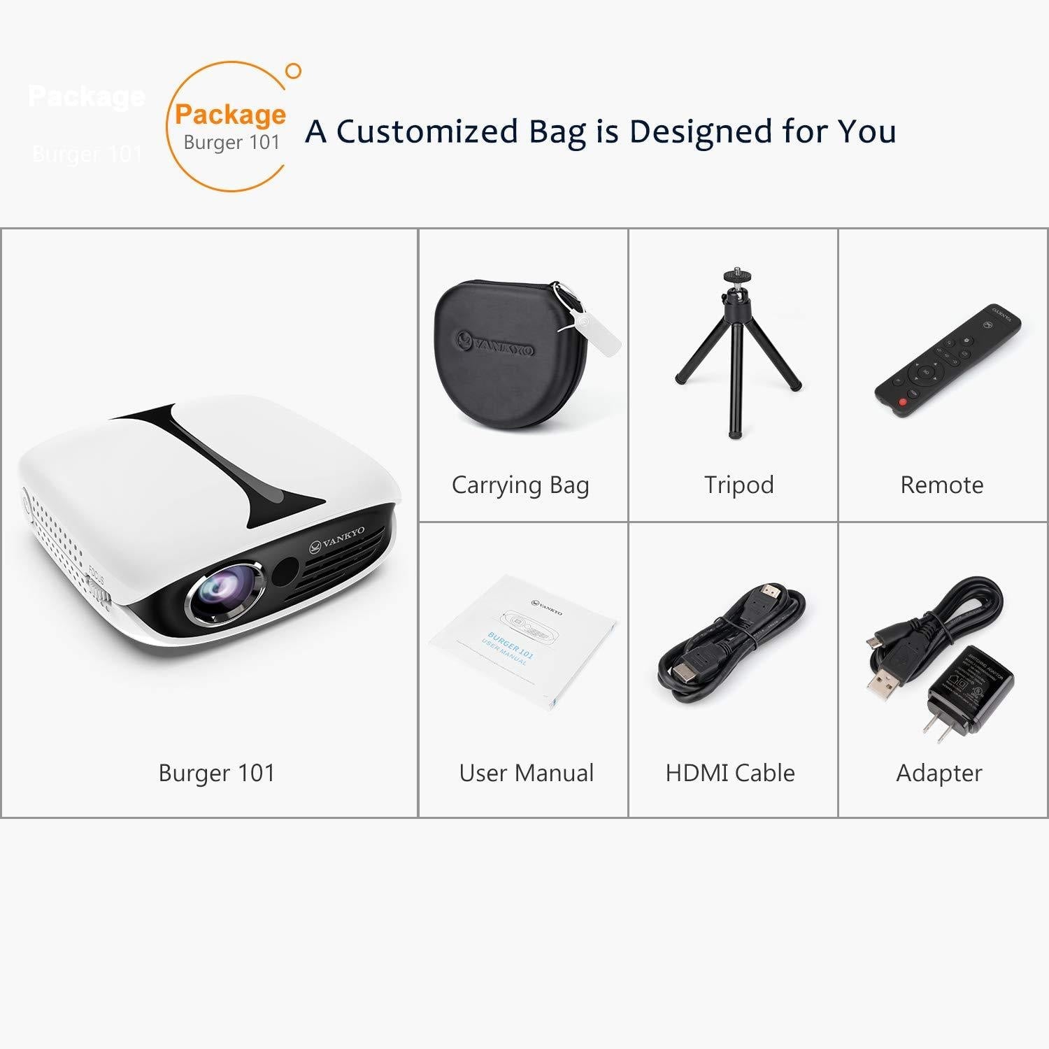 Burger 101 Mini Projector, Remote, Carrying Bag, User Manual, Tripod, HDMI Cable, Adapter